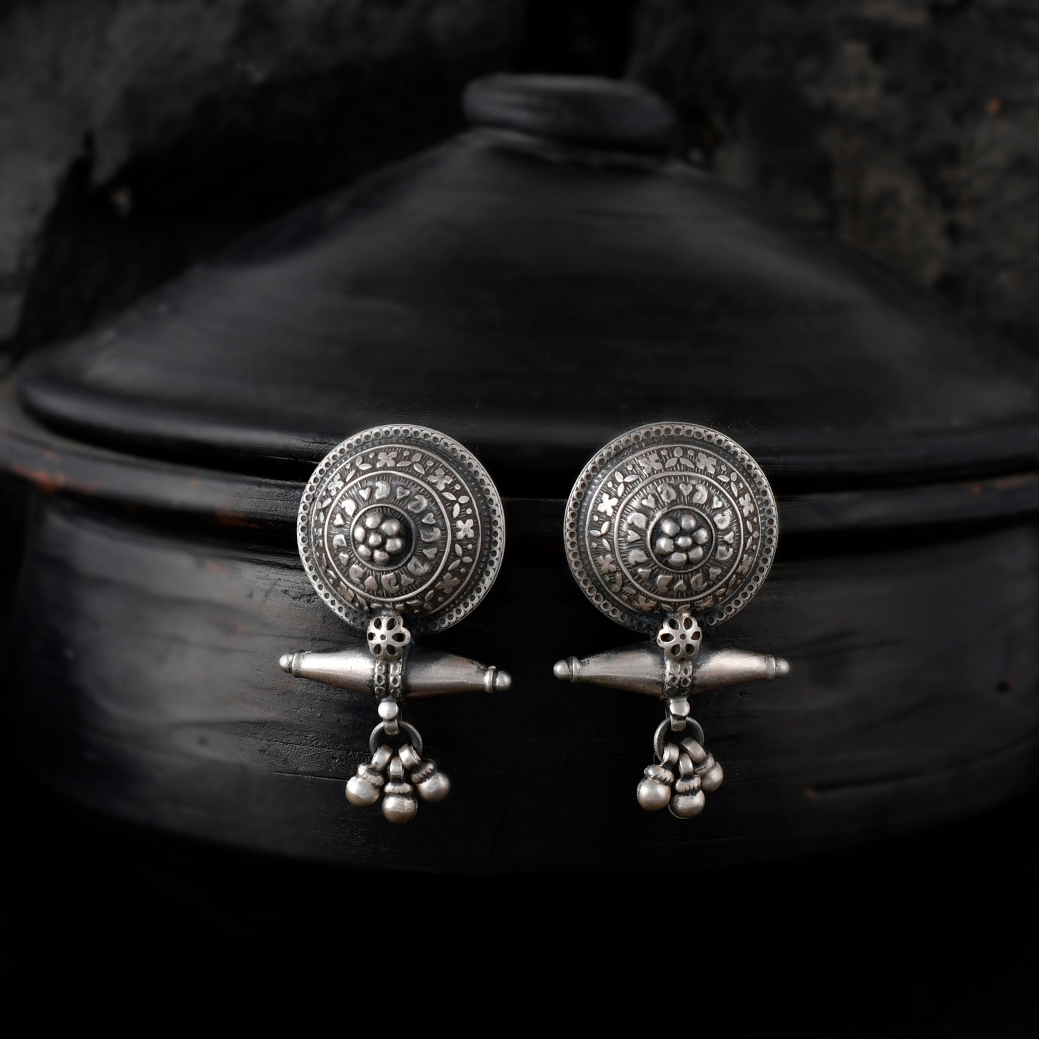 Discover timeless artistry with the Antique Floral Disc Earrings from Antique Silver Strike. Each earring is handmade from pure 925 sterling silver, featuring intricate floral motifs embossed onto a bold disc. The traditional design is enhanced by delicate dangling elements, capturing a balance of heritage and sophistication. These earrings are perfect for adding a graceful yet striking statement to any attire, combining classic craftsmanship with enduring charm.