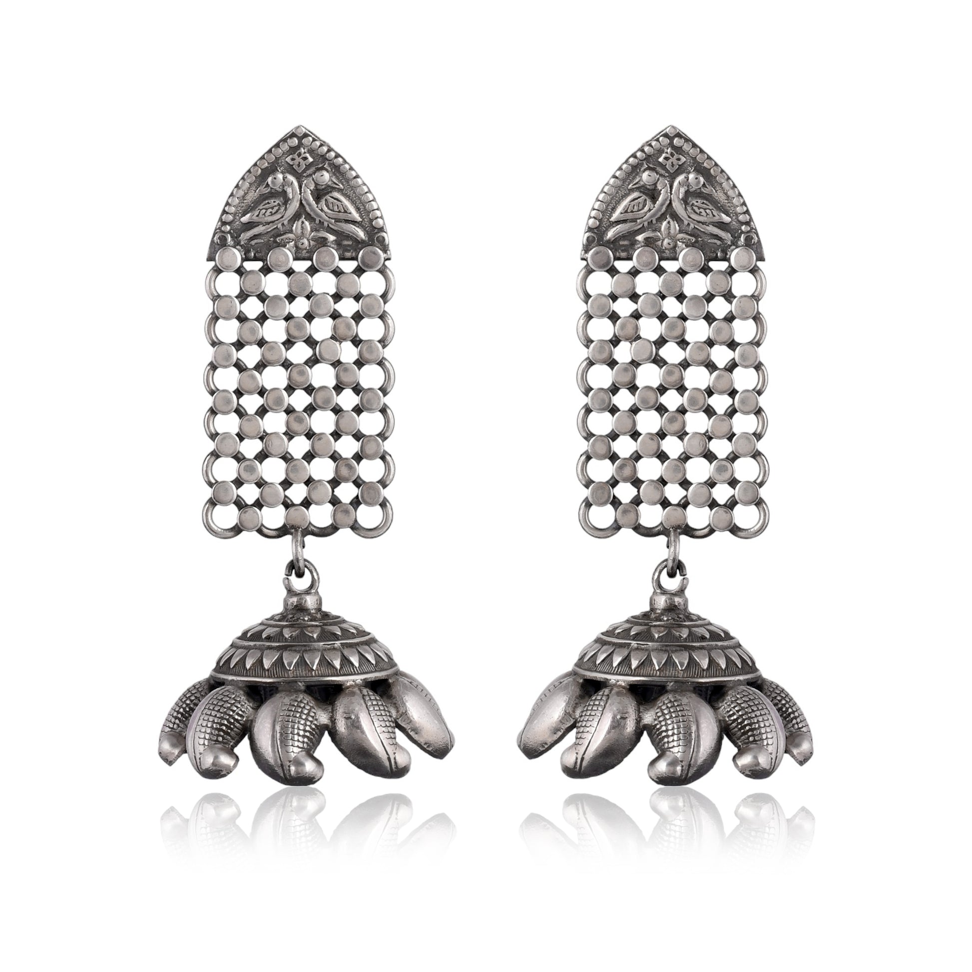 From Antique Silver Strike, the Silver Filigree Mesh Dome Tassel Earrings are a bold interpretation of timeless craft. Designed with a lattice-inspired mesh body and topped with twin bird motifs, the earrings cascade into textured dome drops with sculpted tassels. The oxidized silver finish gives them a rustic elegance, ideal for those who love statement pieces rooted in traditional artistry. Lightweight yet impactful—these earrings turn heads at every occasion.