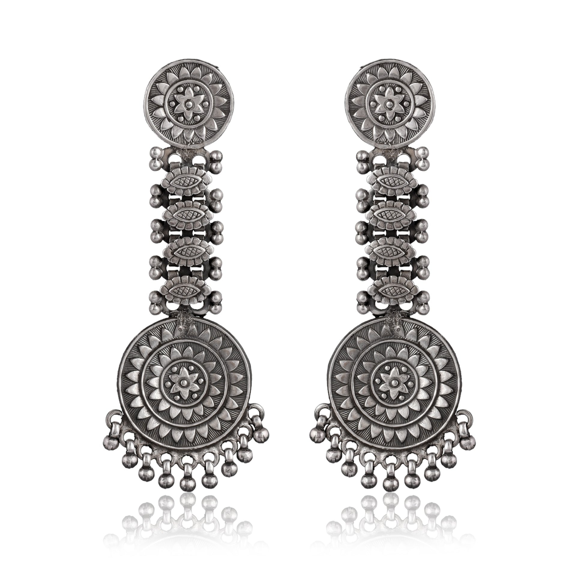 The Mandala Phool Jhumka Earrings by Antique Silver Strike beautifully blend tradition with handcrafted artistry. Made in pure 925 sterling silver, these long danglers feature stacked floral mandala motifs with tribal connectors and tiny ghungroo drops. The oxidized finish enhances every carved detail, creating a bold yet graceful look. Perfect for festive occasions or when you want to make a statement with timeless silver elegance.