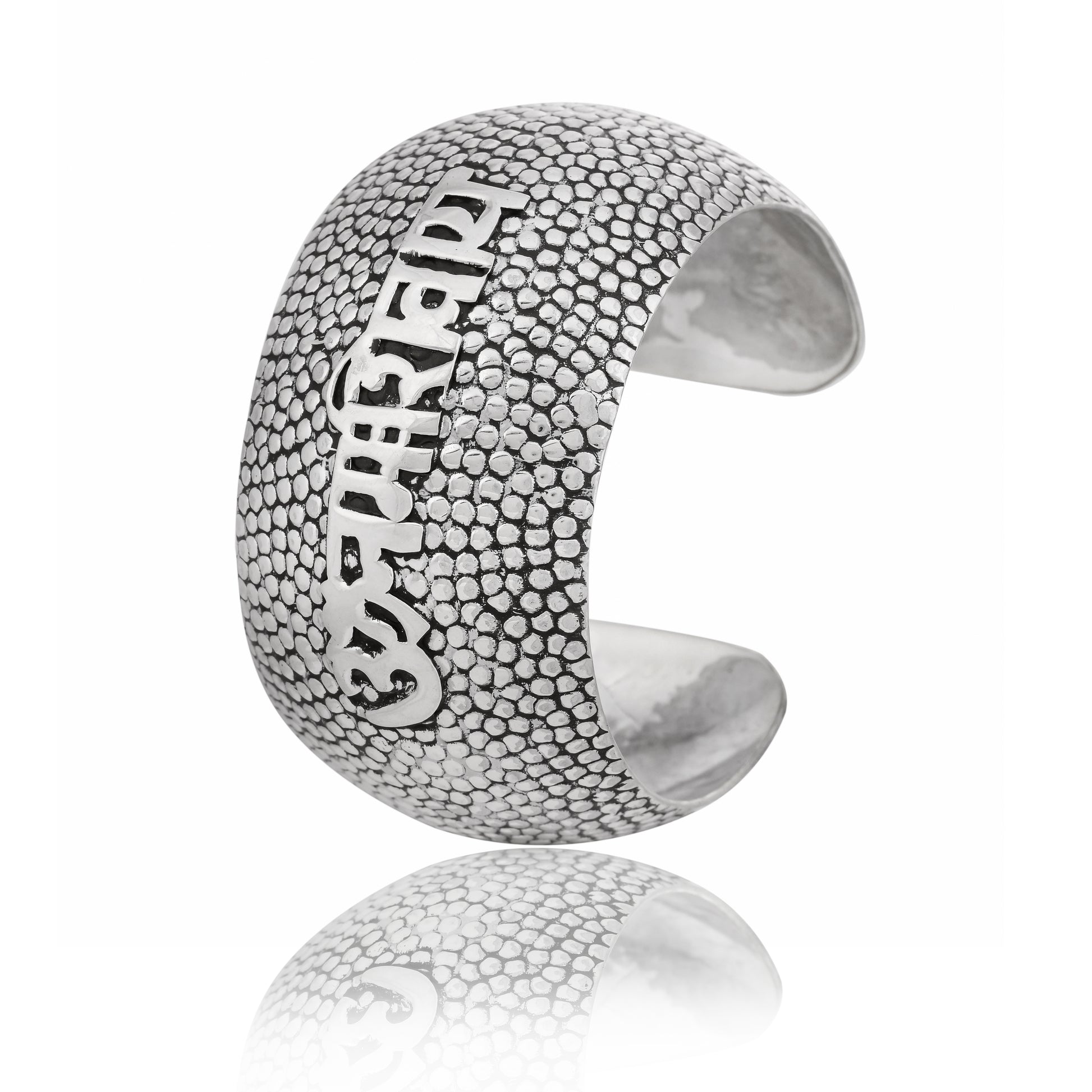 The Om Namah Shivaay Divine Silver Kada Bangle by Antique Silver Strike is a sacred expression of devotion and style. Intricately engraved with the powerful mantra "ॐ नमः शिवाय", this handcrafted bangle resonates with spiritual strength and grace. Its broad oxidized surface features subtle textures that highlight the divine inscription, making it a timeless accessory for the soulfully inclined. Ideal for daily wear or gifting, it brings together tradition, artistry, and a deep spiritual essence.