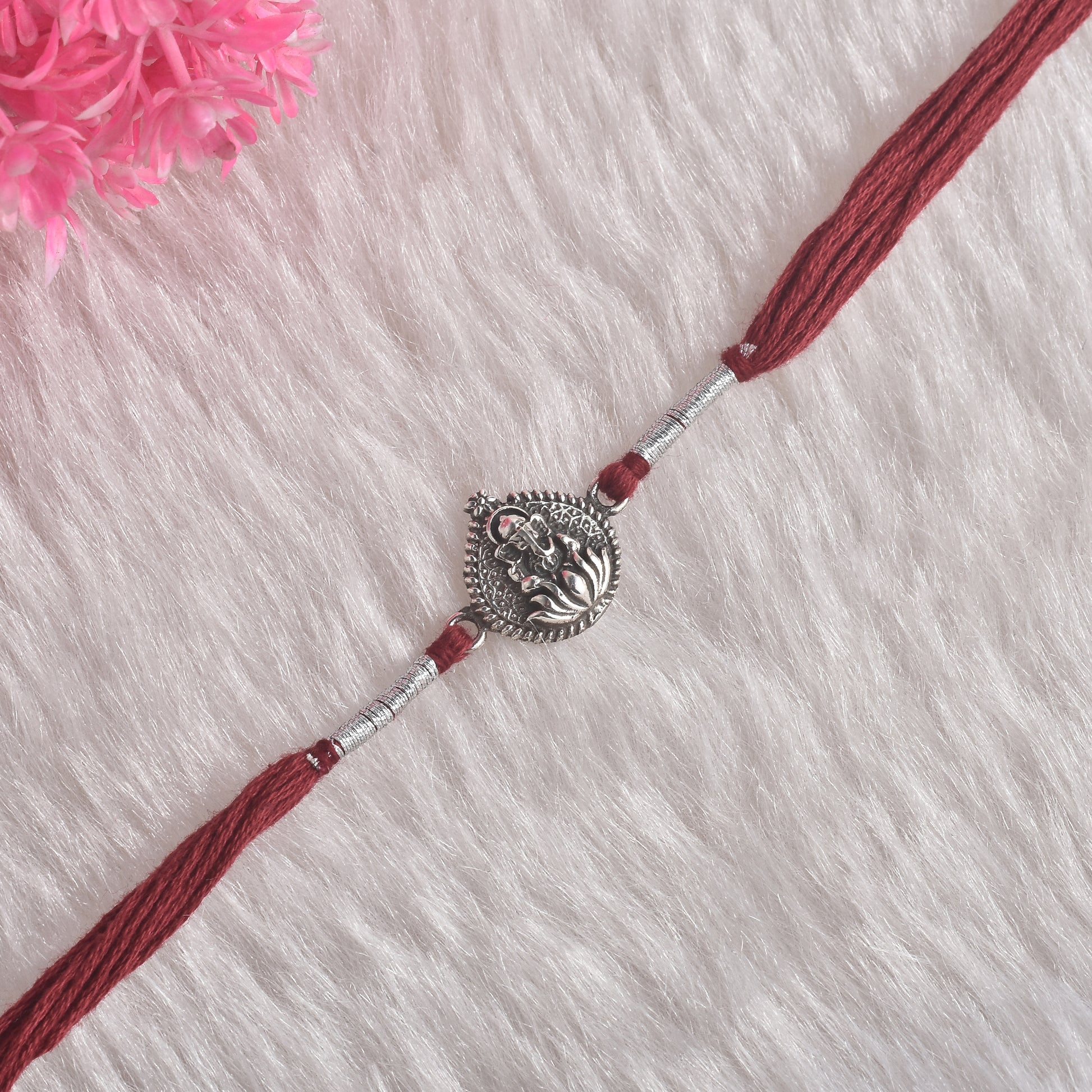 The Silver Kamal Phool and Ganesha Rakhi by Antique Silver Strike blends symbolic beauty with divine strength. Crafted from 925 sterling silver, it features Lord Ganesha seated atop a detailed lotus flower — representing wisdom blooming from purity. With an antique oxidized finish and comfortable thread, this rakhi is both meaningful and elegant. A timeless piece that blesses your bond with protection, positivity, and love.