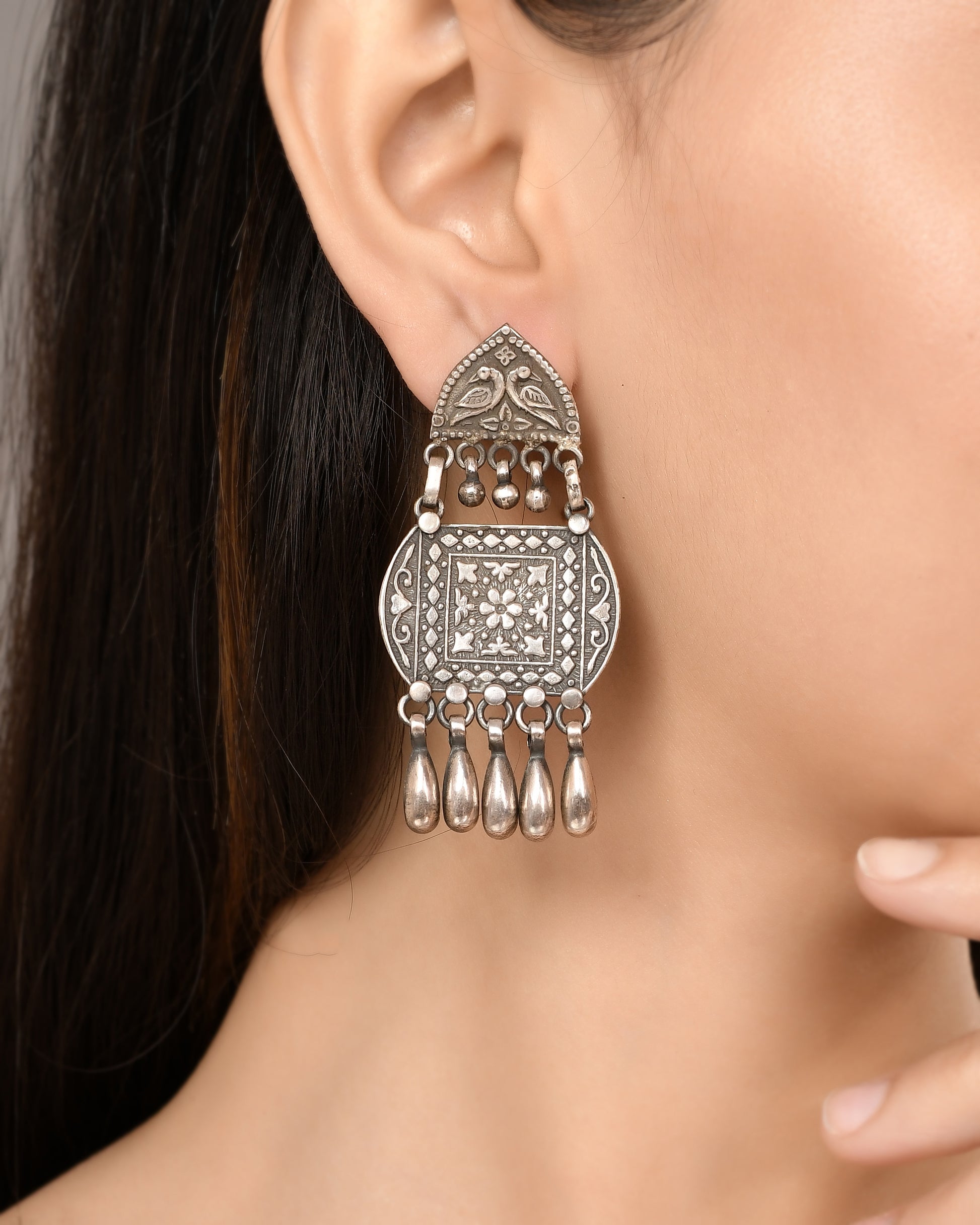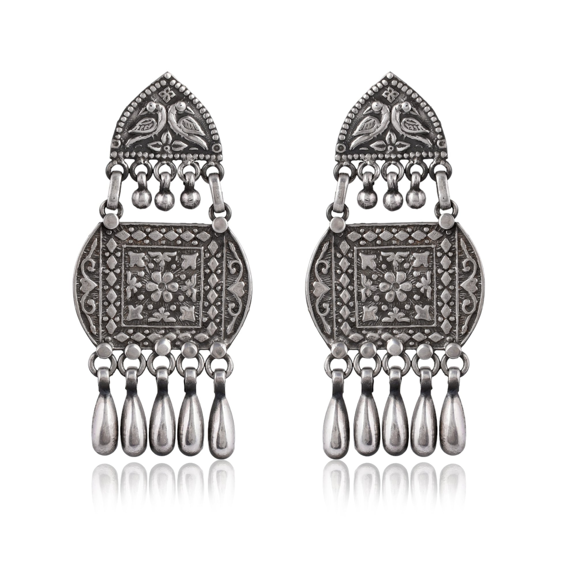 The Silver Bird & Bloom Mandala Drop Earrings from Antique Silver Strike are a tribute to vintage silver artistry. Made in 925 silver, these earrings showcase detailed bird motifs and a central floral mandala framed with elegant drop charms. Perfect for festive or everyday ethnic styling, they combine tradition and charm effortlessly. Lightweight yet statement-worthy, they pair beautifully with sarees, suits, or boho attire, adding grace and heritage-inspired elegance to your look.