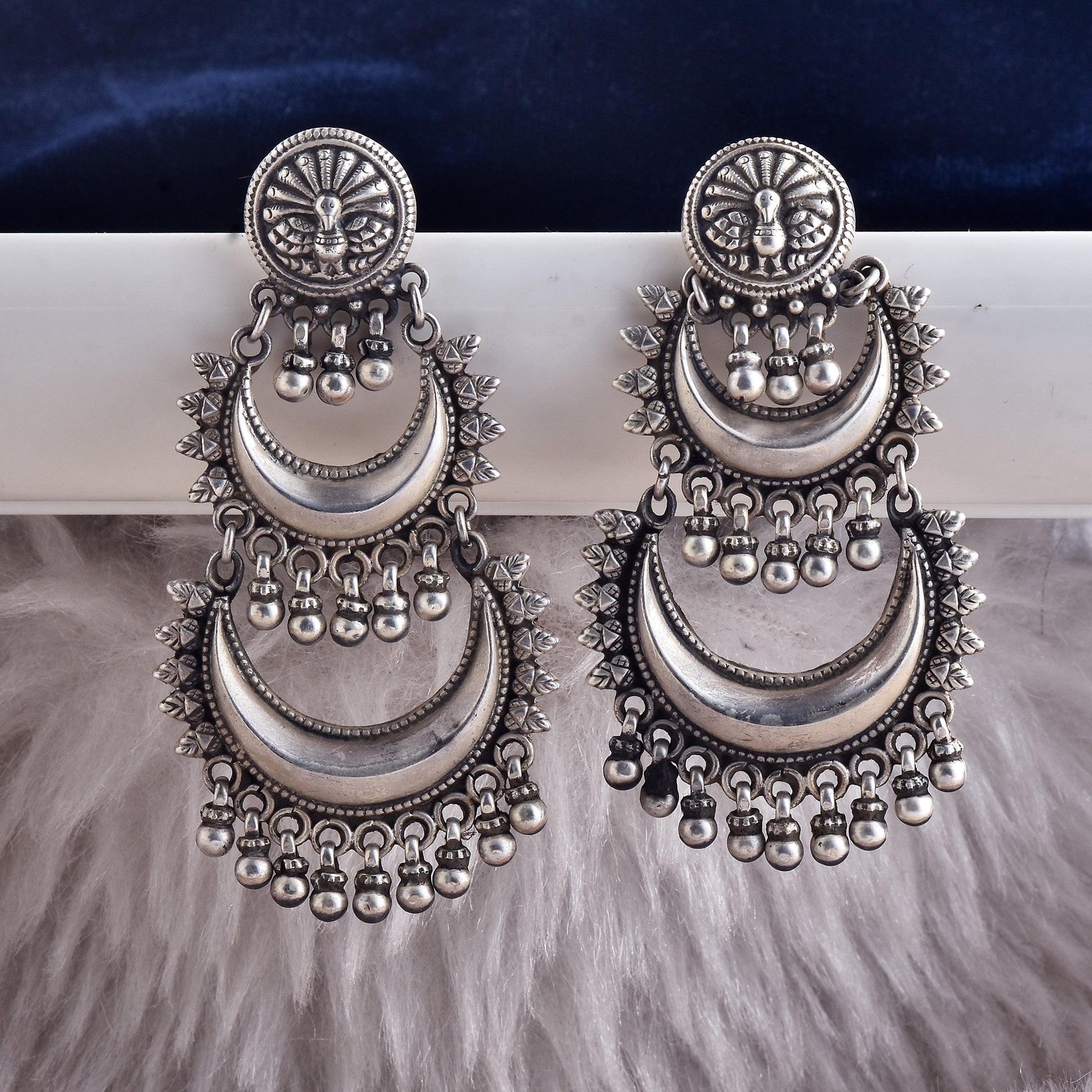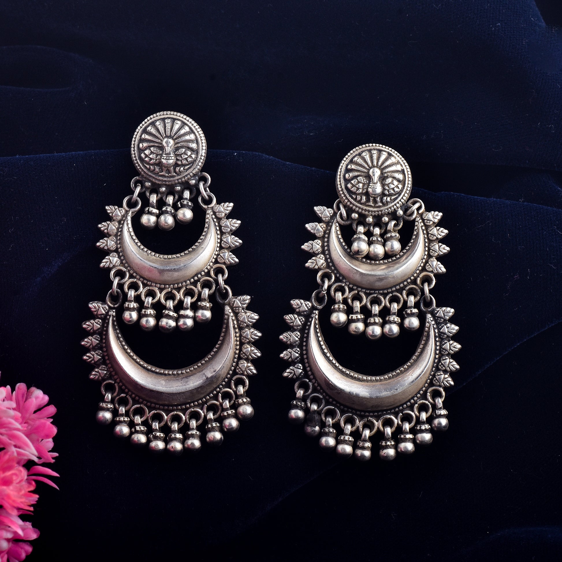 Crafted with care by skilled artisans, the Silver Crescent & Bells Chimes Jhumka Earrings by Antique Silver Strike celebrate the beauty of pure 925 sterling silver. The crescent-shaped frame showcases detailed leaf-like textures, holding a dome jhumka that sways gracefully. Accented with tiny ghungroo drops, these earrings are lightweight yet statement-worthy. A perfect companion to sarees, kurtas, or boho styles, these handmade jhumkas carry the soul of tradition in every curve and chime.