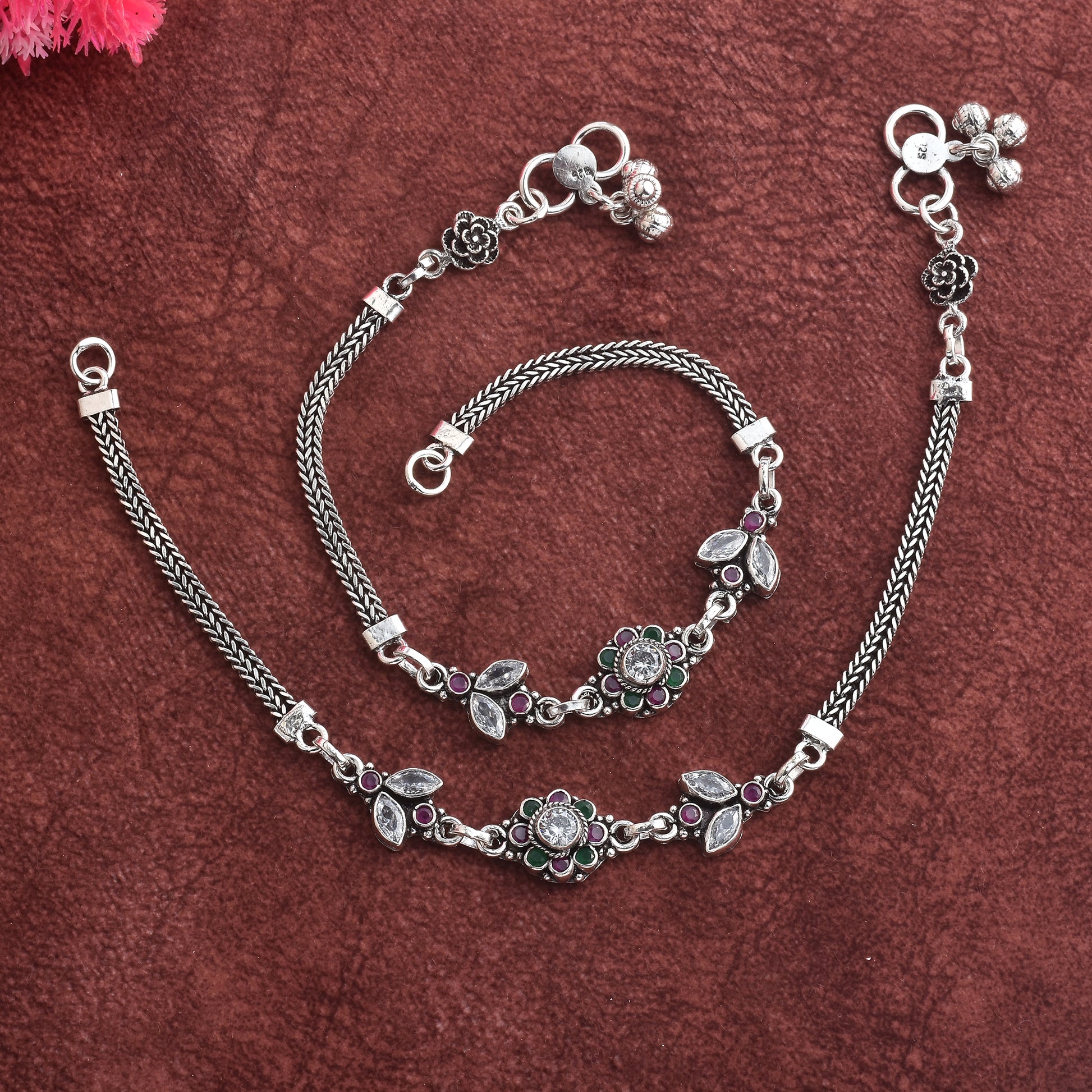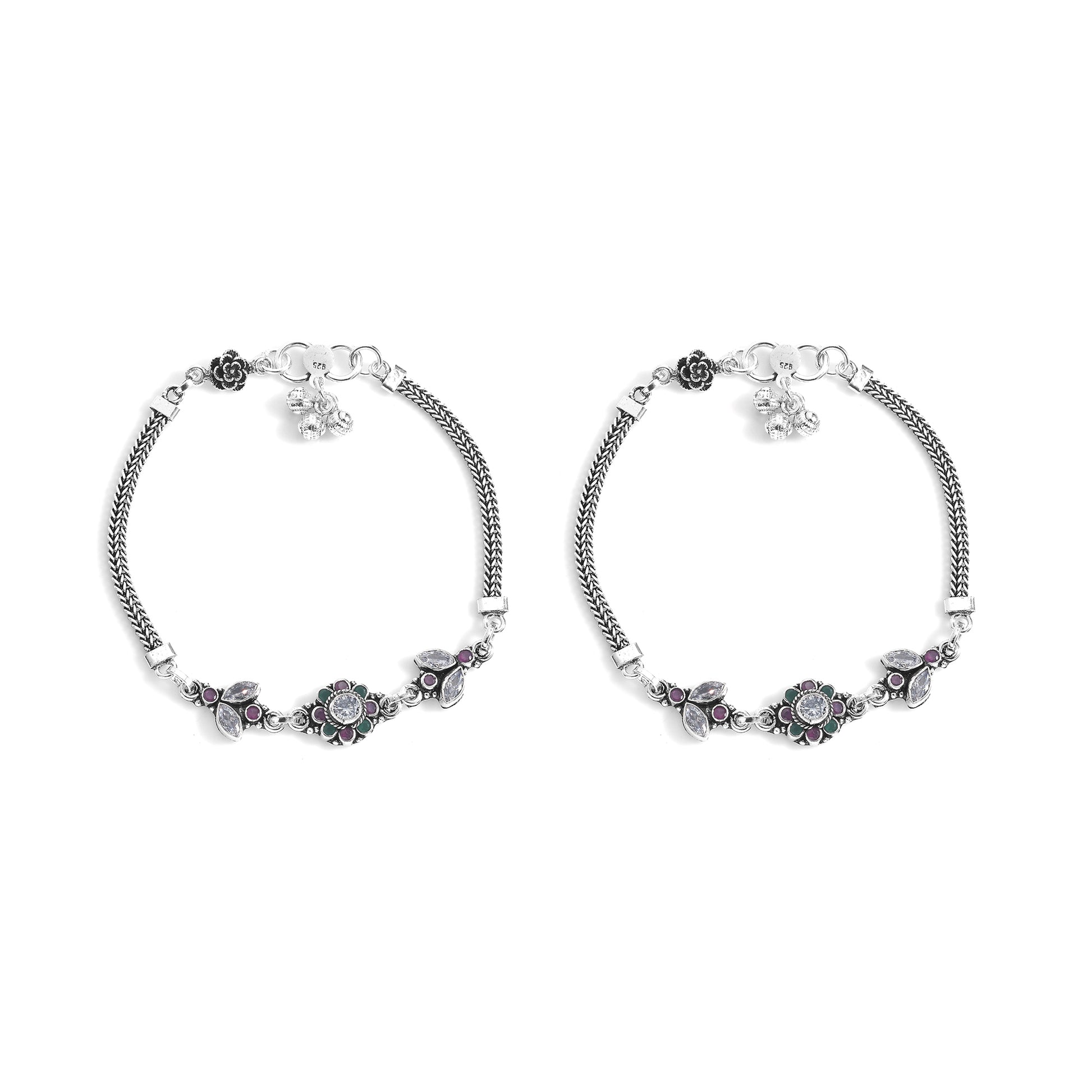 Silver Cut Stone Flower Bouquet Anklet( Pair)