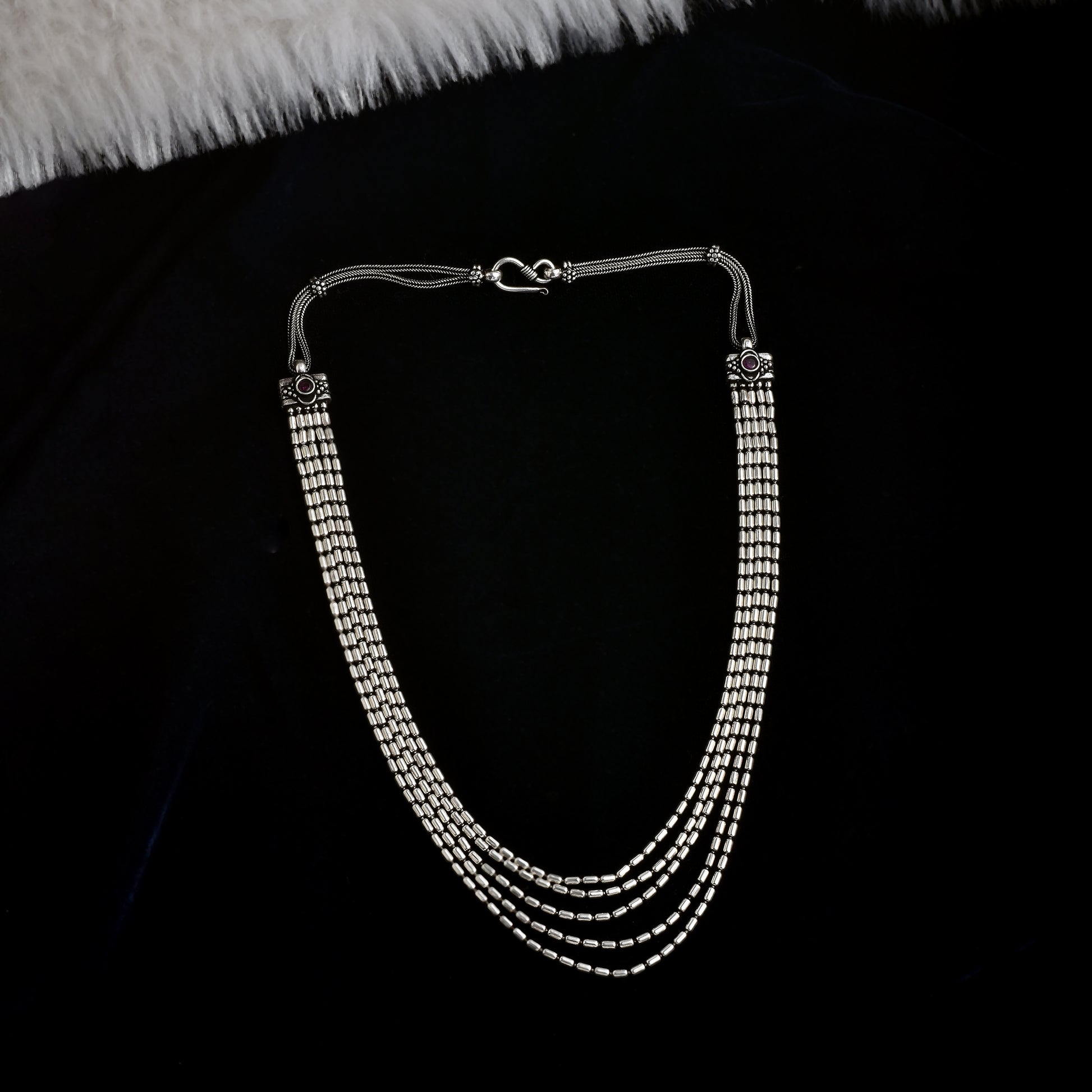 The Silver Cylindrical Five Layered Neckchain by Antique Silver Strike is a true showstopper. Made from pure 925 Sterling Silver and crafted entirely by hand, this necklace showcases five elegant layers, each detailed with silver cylindrical beads. The design flows effortlessly across the neckline, giving a rich and graceful appearance. Whether you’re attending a family gathering or dressing up for a celebration, this piece adds a classic and bold statement. It’s silver jewelry done right—with a layered, handcrafted twist.