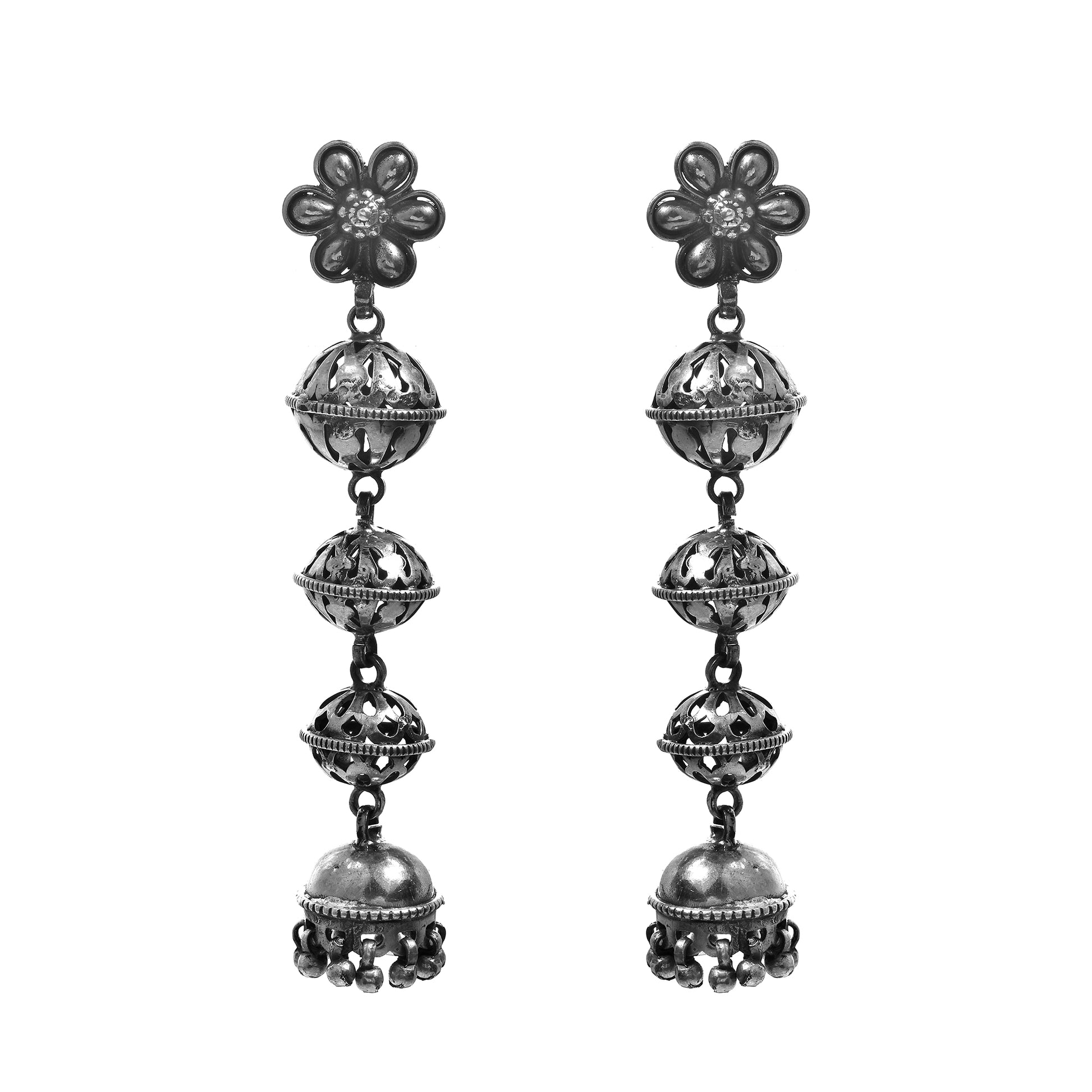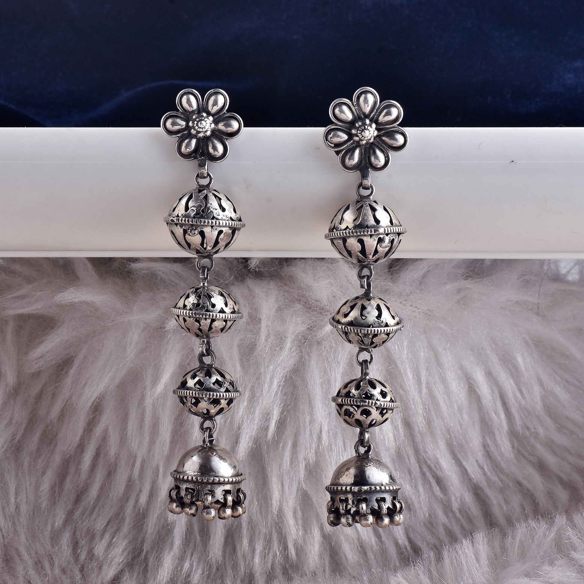 Add a graceful touch to your jewelry box with the Silver Daisy Flower Mala Jhumka Earrings by Antique Silver Strike. Crafted in pure 925 Sterling Silver, these handmade earrings feature a dainty daisy flower on top, followed by a curved arch and classic jhumkas. The hanging silver bead ‘mala’ enhances the traditional look, while the oxidised finish gives a vintage vibe. Perfect for festive looks or cultural celebrations, these earrings are a tribute to timeless design and handcrafted beauty.