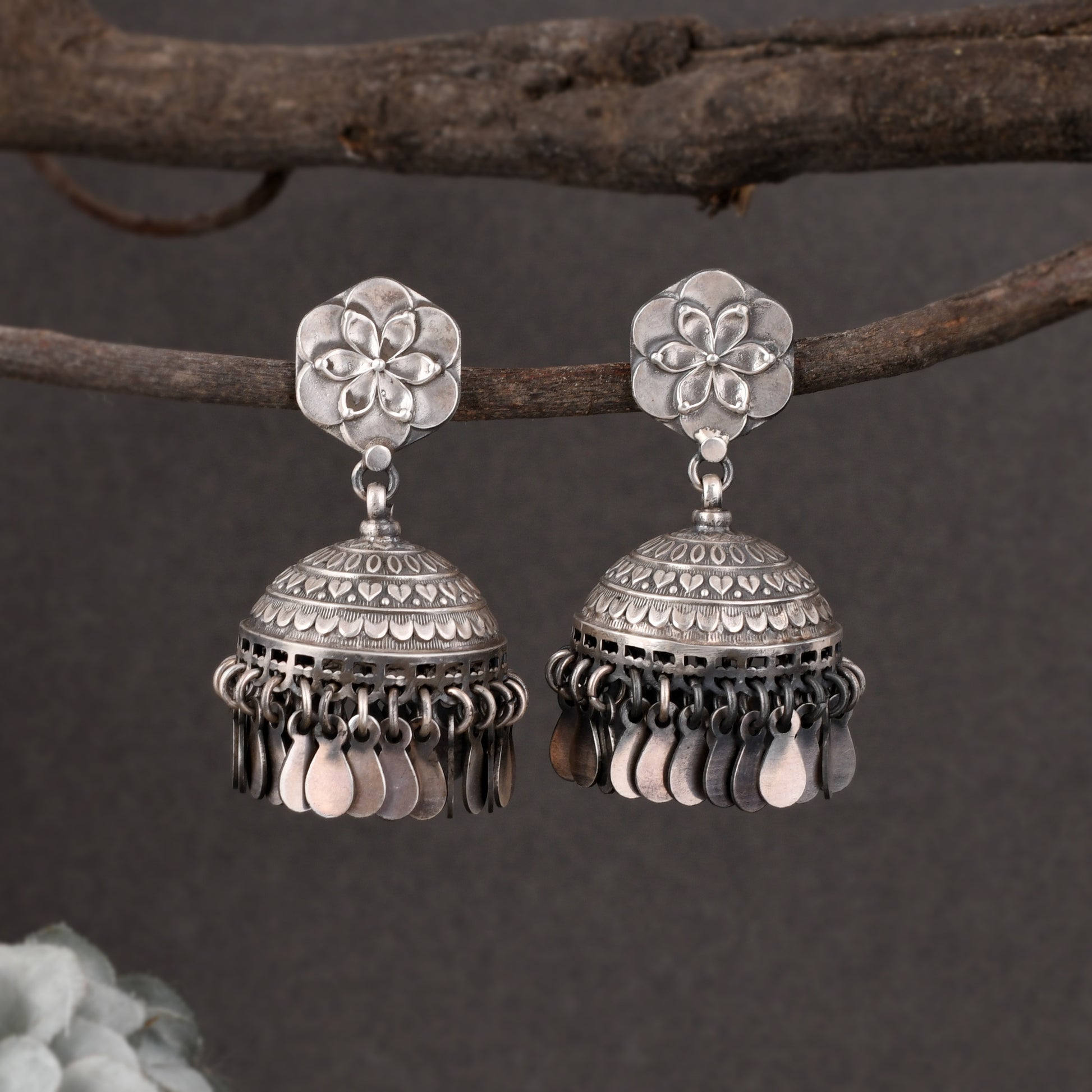 Let your style bloom with the Silver Dazzling Lotus Flower Jhumka Earrings from Antique Silver Strike. These beautiful earrings are handmade using pure 925 Sterling Silver and feature an intricate lotus flower design that flows into a graceful jhumka drop. Light, elegant, and rich in detail, they celebrate traditional Indian craftsmanship and natural inspiration. A perfect piece for those who love floral beauty with a timeless twist.