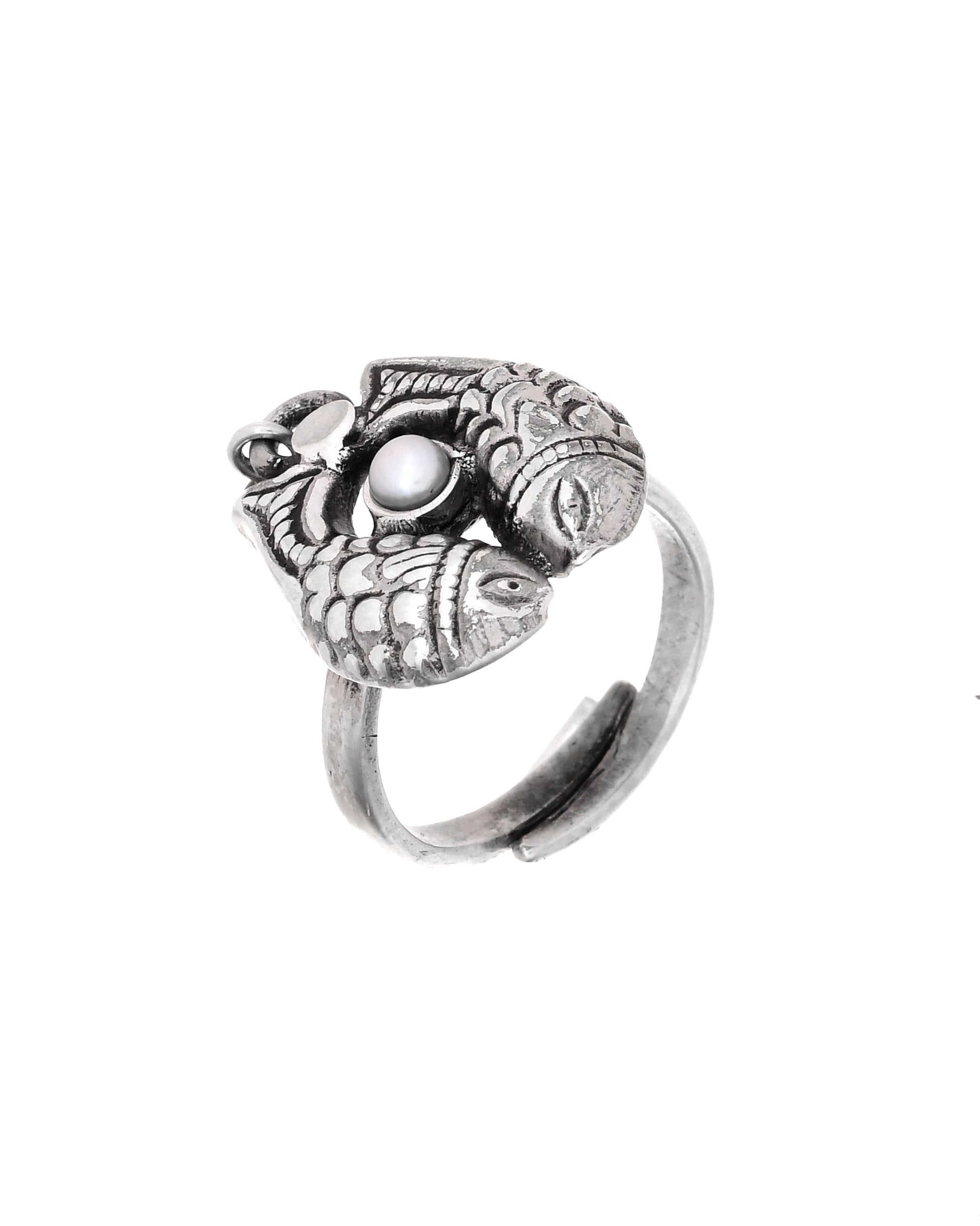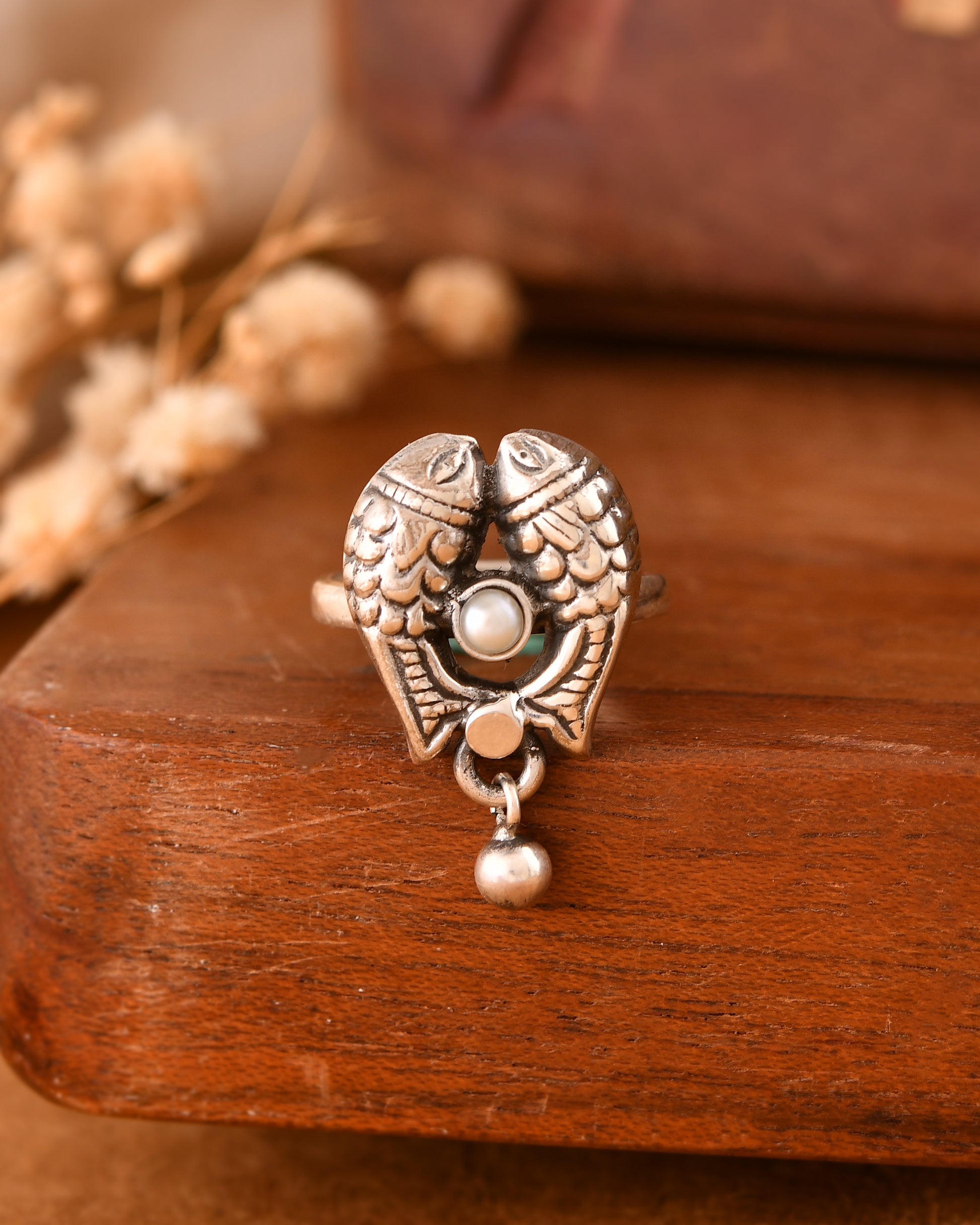 The Silver Fish And Pearl Ring by Antique Silver Strike is a handmade piece crafted from pure 925 sterling silver. The ring features a beautiful fish design holding a smooth pearl, symbolizing calmness and good luck. Its artistic detailing and antique finish make it perfect for daily wear or special occasions. Comfortable and lightweight, this ring adds a soft, elegant charm to your style. A lovely choice for anyone who enjoys natural-inspired and handcrafted silver jewellery.