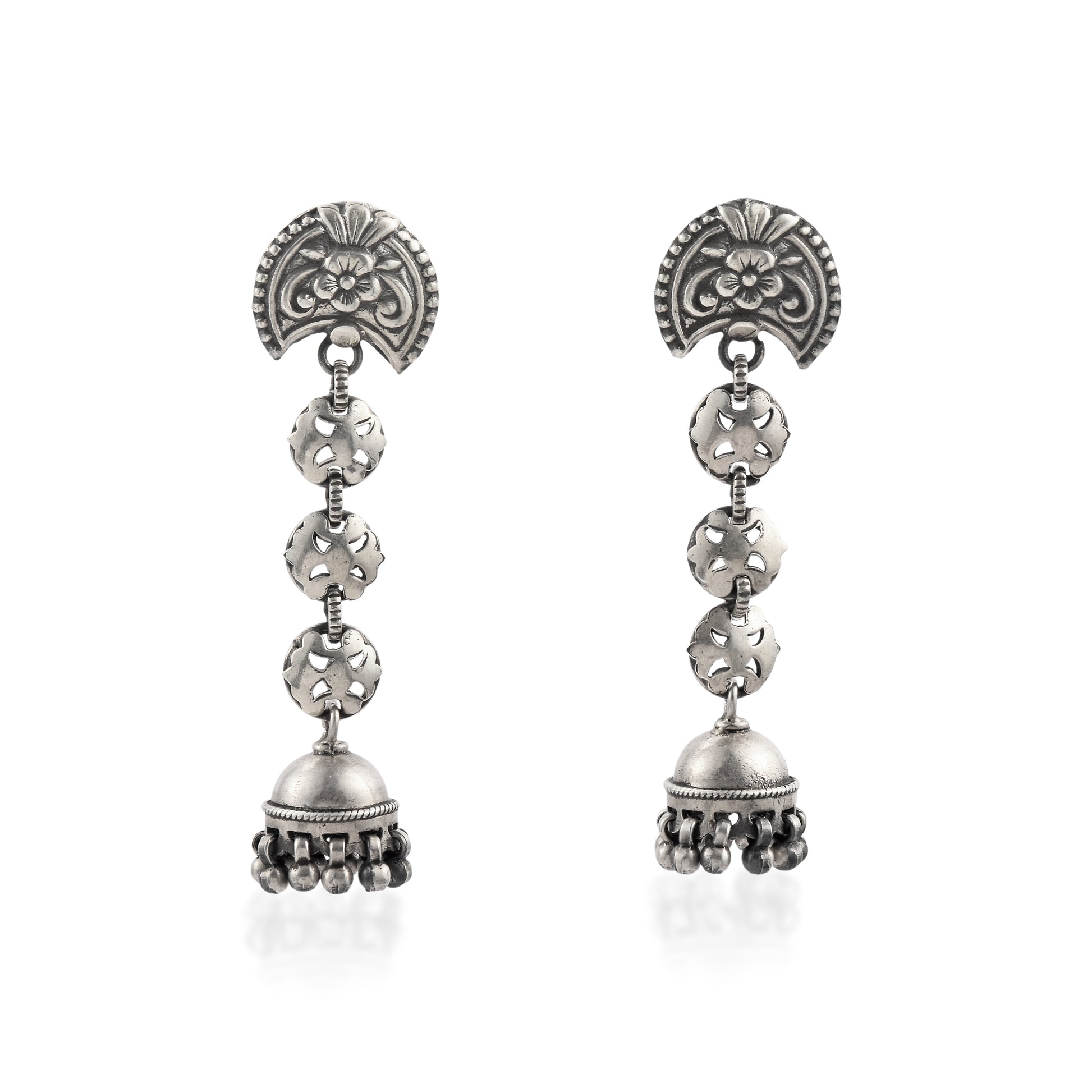 Antique Silver Strike presents the Silver Floral Cascade Earrings, where heritage meets modern grace. Expertly crafted in 925 sterling silver, these earrings feature a trail of handcrafted flowers that flow beautifully in a cascading form. Their oxidized polish enhances each intricate detail, adding timeless depth and charm. Whether paired with ethnic attire or fusion wear, they add a radiant touch of artistry and feminine poise to any look.
