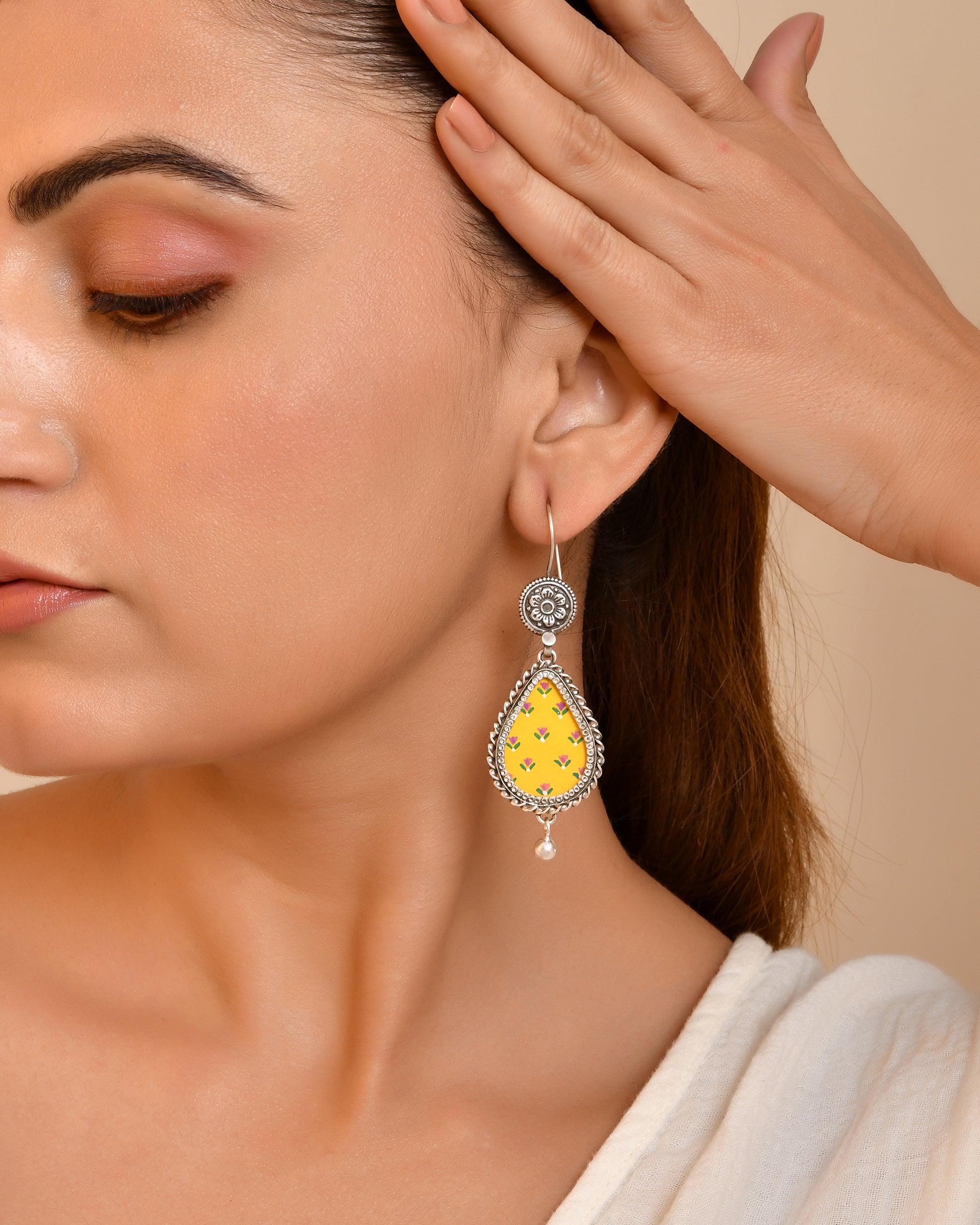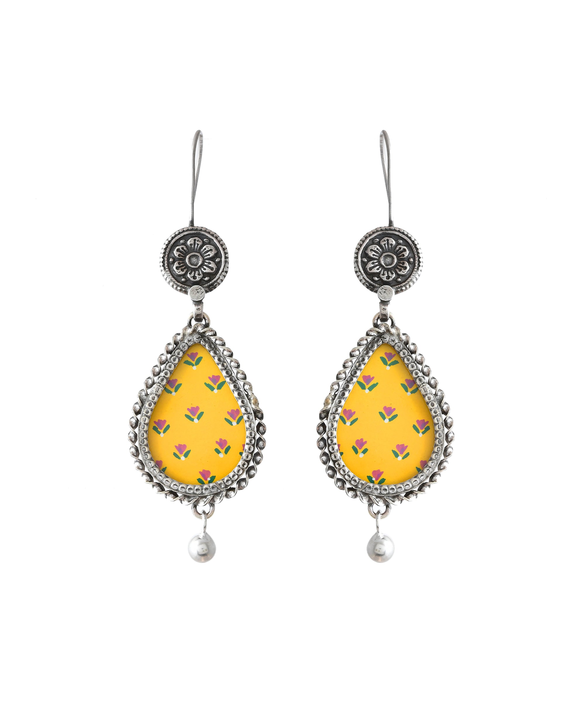Handmade in pure 925 sterling silver, the Silver Flower Drop Hasthkala Dangle Earrings from Antique Silver Strike showcase a lovely flower motif with elegant hanging drops. The design has a simple yet artistic appeal that suits all styles. These earrings shine with an antique finish and offer a comfortable light feel for daily wear. Whether for festive looks or everyday outfits, they add a graceful touch. A perfect pair for lovers of nature-inspired silver earrings.