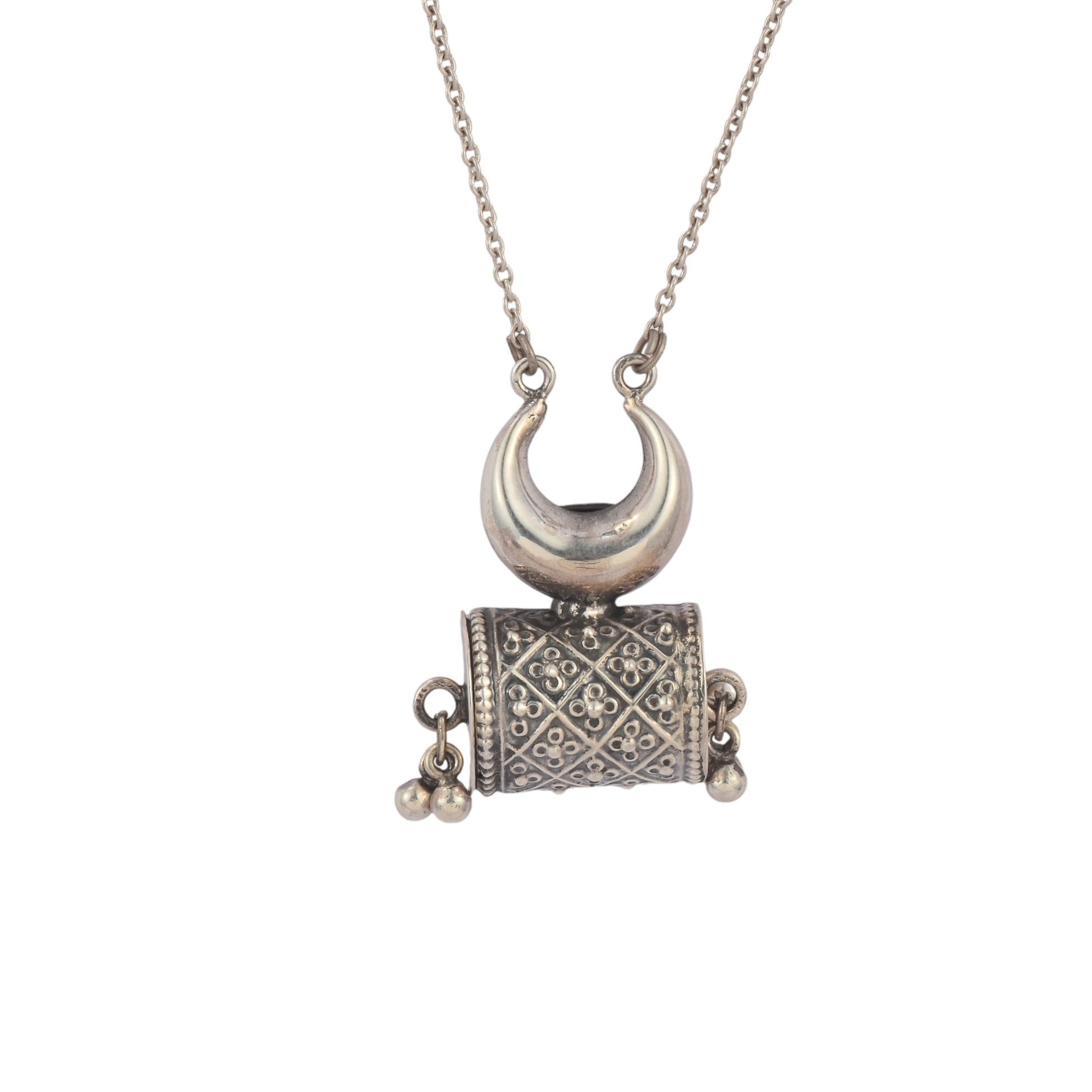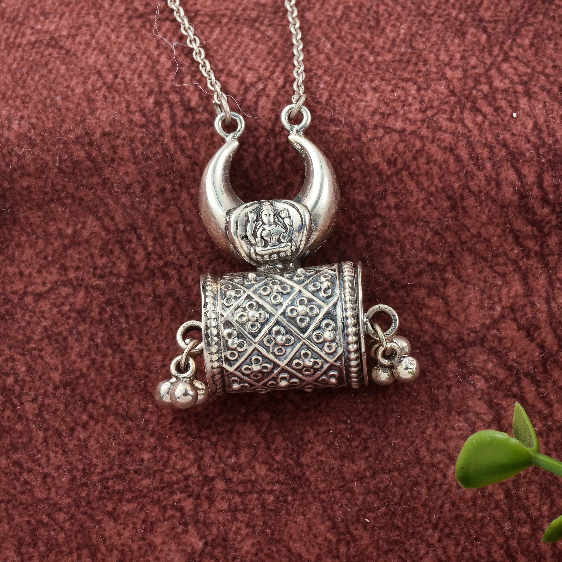 The Silver Laxmi Tabeez Pendant With Chain by Antique Silver Strike is a handmade symbol of blessings and prosperity. Crafted in pure silver, it features a beautifully detailed Tabeez pendant inspired by Goddess Laxmi, the goddess of wealth and fortune. The intricate design adds a touch of traditional elegance, while the matching chain completes the divine look. Perfect for daily wear or festive occasions, this pendant keeps positivity and protection close to your heart.