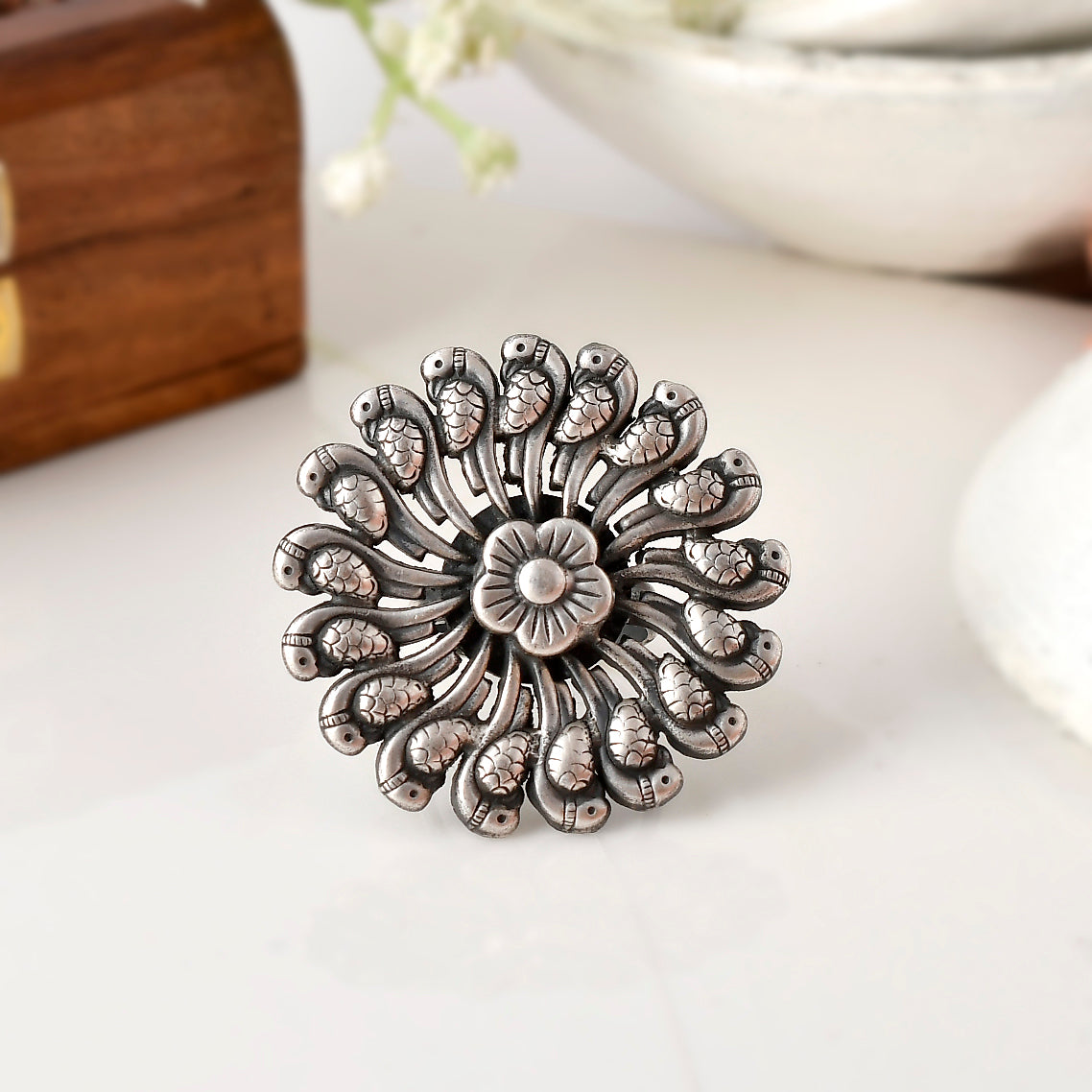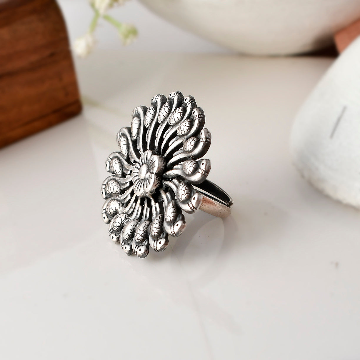 The Silver Parrot Flower Ring from Antique Silver Strike is a nature-inspired masterpiece in pure 925 sterling silver. Handcrafted with intricate detailing, it features a playful parrot surrounded by floral patterns, symbolizing joy and beauty. The oxidized silver finish gives it an antique look, while the adjustable band ensures a perfect fit. Ideal for lovers of statement silver rings with a story.