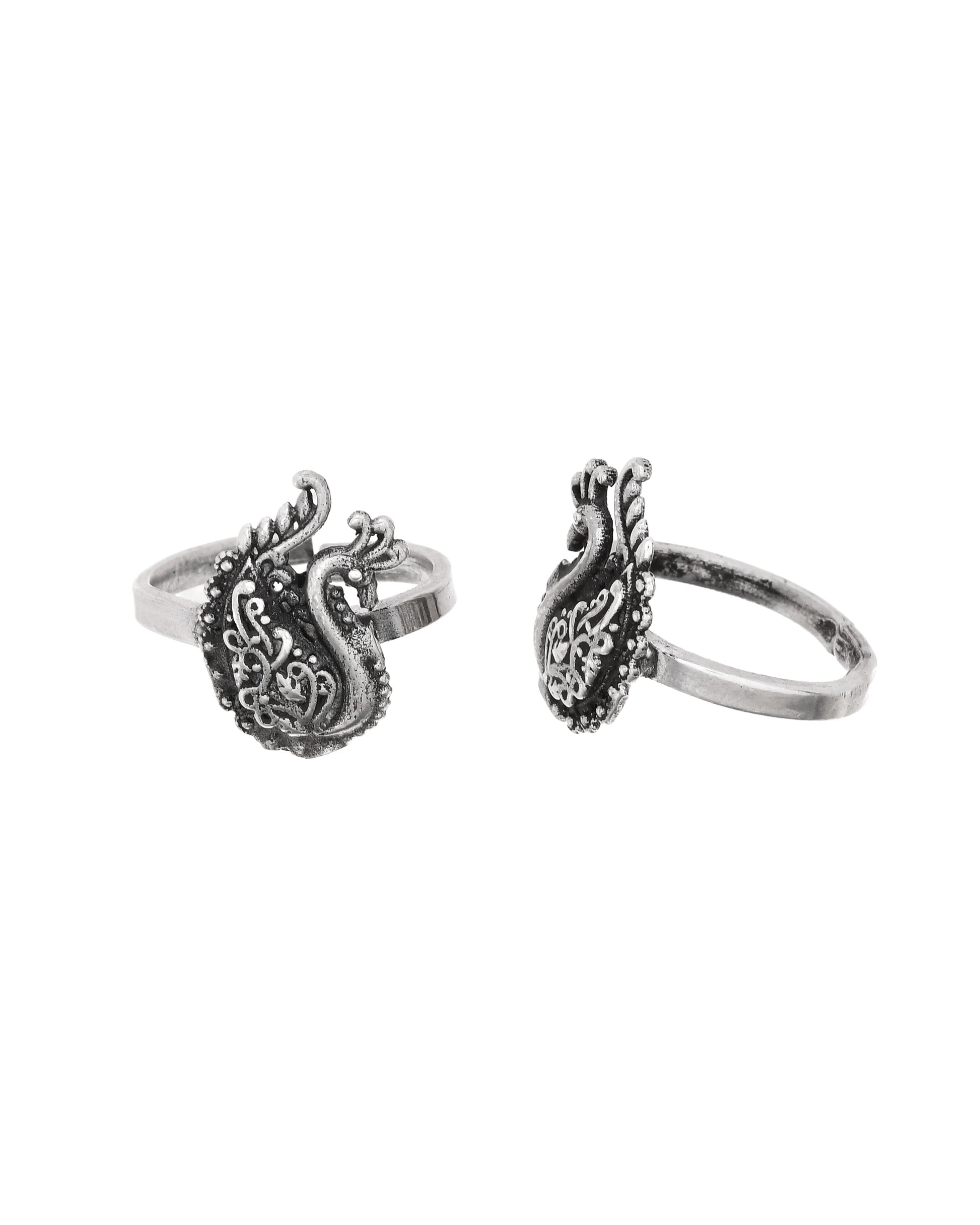 The Silver Peacock Toe-rings (Pair) by Antique Silver Strike are beautifully handmade using pure 925 sterling silver. Designed with elegant peacock motifs, these toe-rings reflect grace, beauty, and traditional Indian artistry. The adjustable fit ensures comfort for daily wear. Their antique finish highlights the fine detailing and adds a rich ethnic charm. Perfect for everyday use, festive occasions, or gifting, these toe-rings are a timeless choice for lovers of handcrafted silver jewellery.