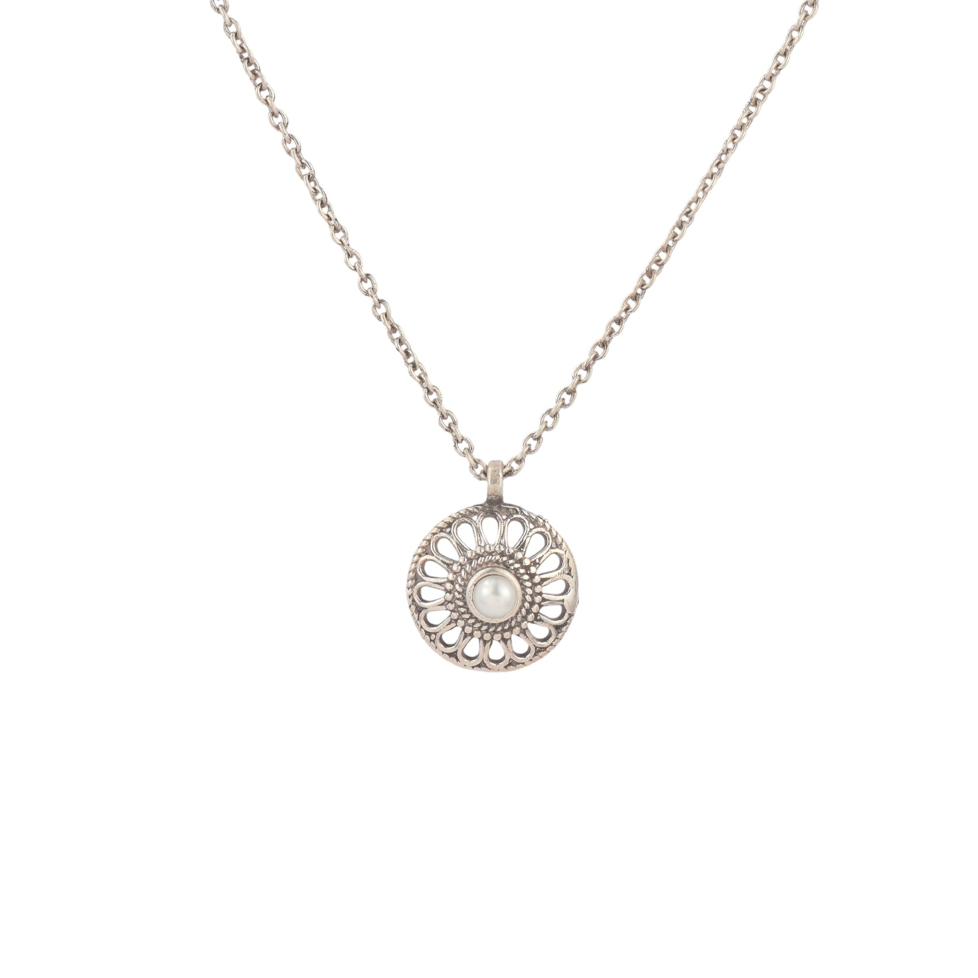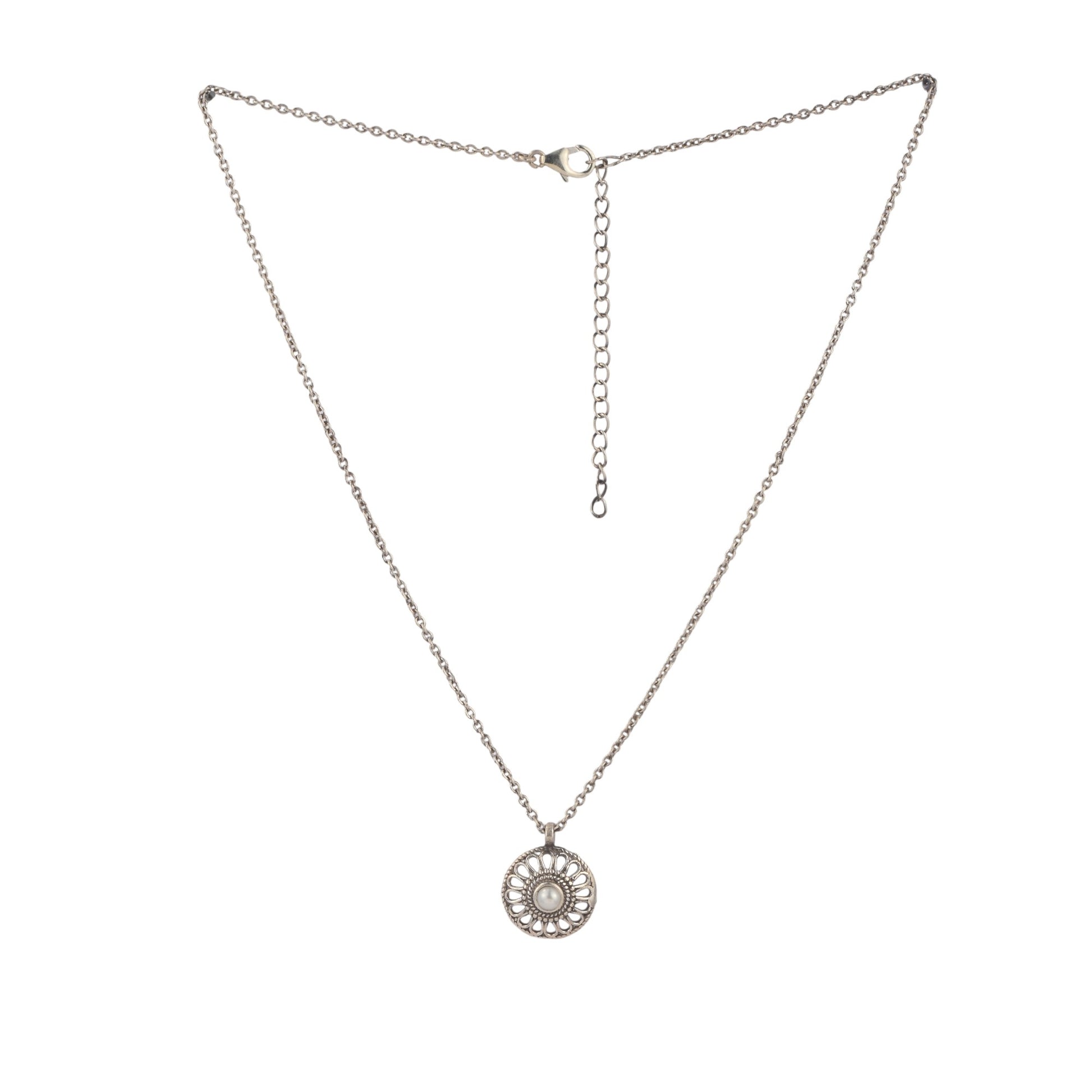 The Silver Pearl Wheel Pendant With Chain from Antique Silver Strike blends simplicity with charm. Handcrafted in silver, it showcases a circular wheel design adorned with a delicate pearl at the center. Elegant and graceful, this pendant is ideal for everyday wear or as a thoughtful gift.