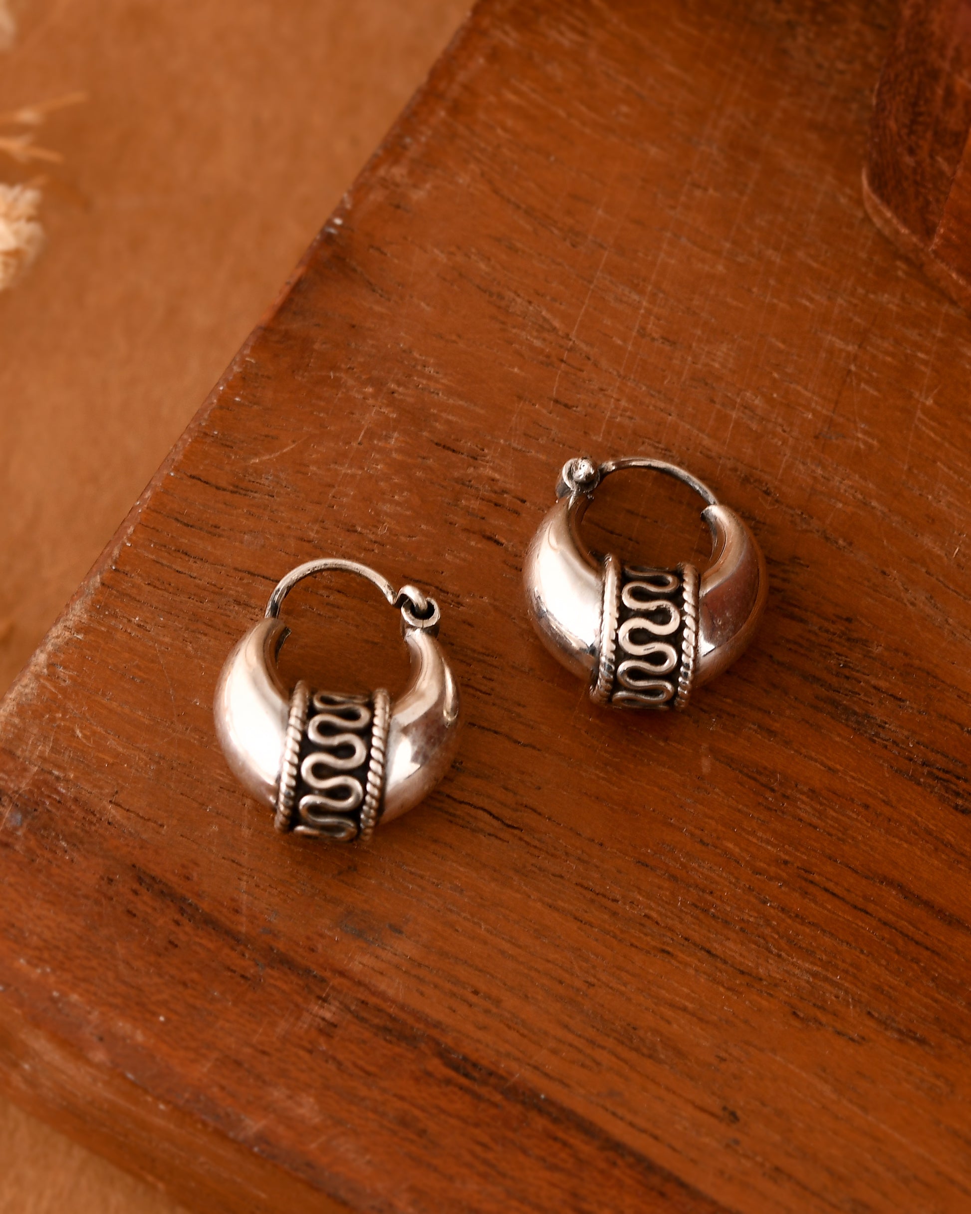 The Silver Spiral Murki Earrings by Antique Silver Strike are beautifully handmade using pure 925 sterling silver. Designed with a unique spiral pattern in a classic murki style, these earrings bring a modern twist to a traditional design. The smooth antique finish adds depth and elegance. Lightweight and comfortable, they are perfect for daily wear and festive occasions. A stylish choice for those who love minimal yet artistic handcrafted silver jewellery.