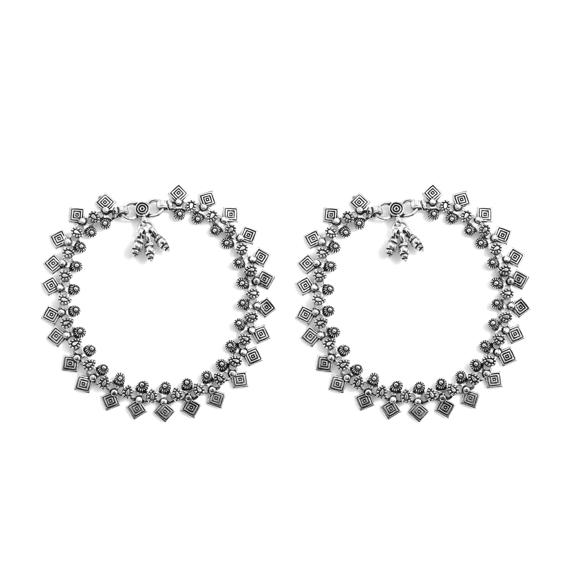 Step into the world of tradition and tribal artistry with Antique Silver Strike’s Silver Tribal Square Charm Anklet (Pair). Made from authentic 925 sterling silver, each anklet features tiny floral beads and perfectly placed square charms, creating a lively, rhythmic design. The oxidized finish brings out its intricate textures, making it a versatile piece for festivals or everyday elegance. Handmade with care, this anklet set adds depth, detail, and a hint of bold tribal beauty to your silver collection. Let your ankles tell a story of timeless tradition and silver craftsmanship.