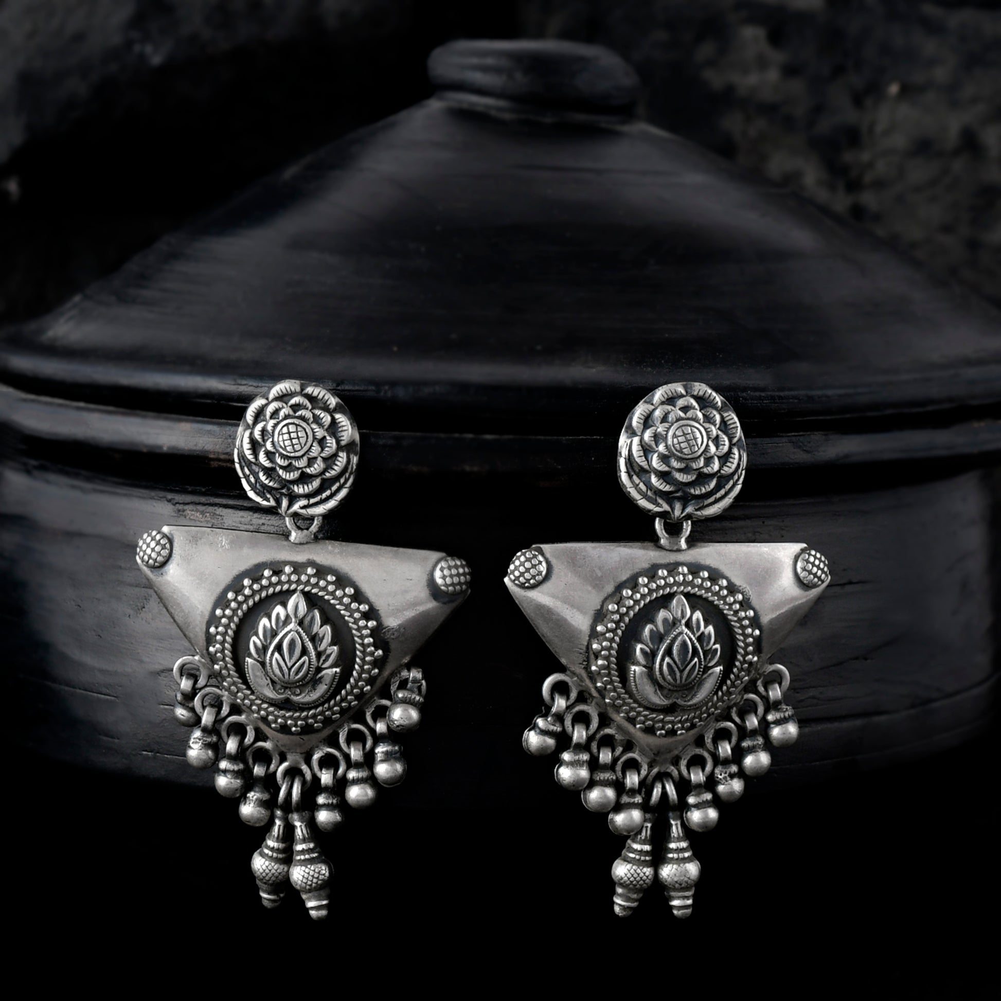 Handcrafted from pure 925 sterling silver, the Silver Tribal Tikona Jhumka Earrings feature a distinctive triangular (tikona) design adorned with intricate tribal motifs. These earrings embody bold ethnic charm with finely detailed engravings, lightweight construction, and elegant dangling elements that add rhythmic movement. Perfect for festive occasions or adding a unique tribal statement to everyday wear, these jhumkas celebrate heritage craftsmanship with contemporary style.