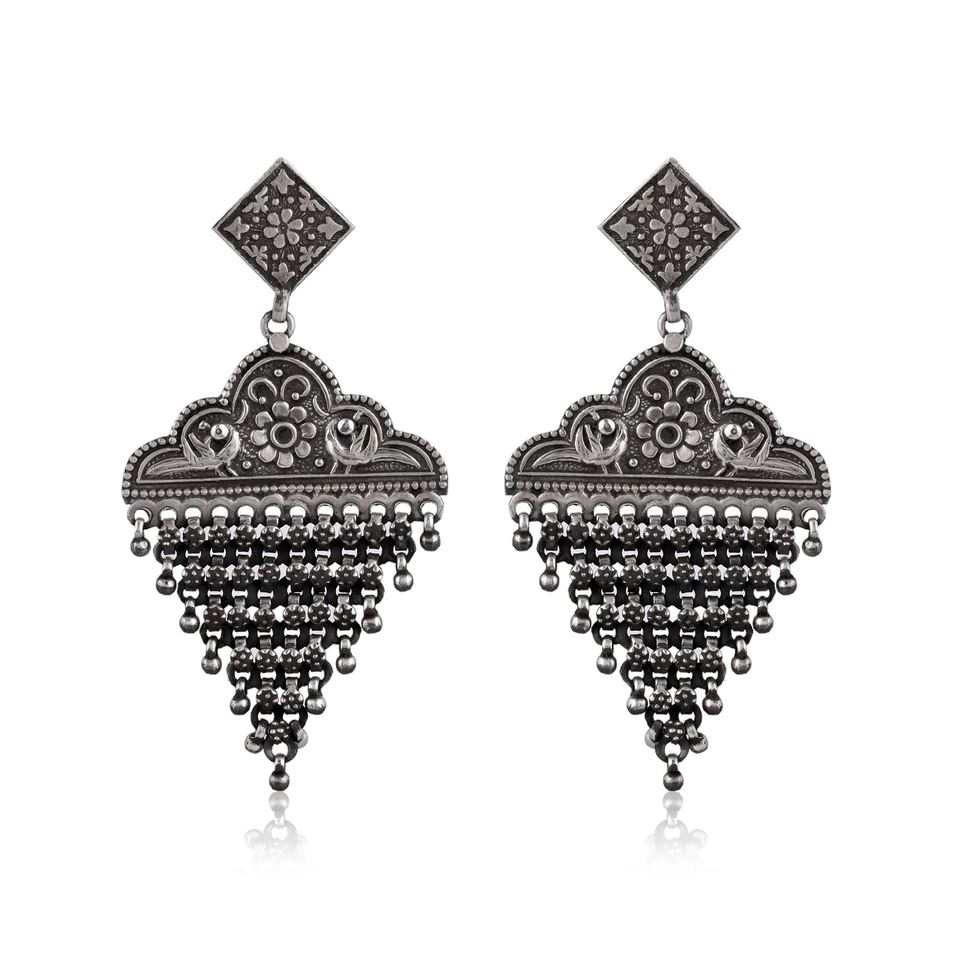 Add charm to your collection with Silver Twin Bird Bloom Jhumka Earrings from Antique Silver Strike. Made from pure 925 sterling silver, each piece is lovingly handcrafted by skilled artisans. The design showcases twin birds resting above a blooming floral pattern, leading to a detailed triangular mesh drop. These earrings beautifully blend tradition and elegance, making them ideal for ethnic and fusion wear. A must-have for those who appreciate fine, handmade silver jewelry.