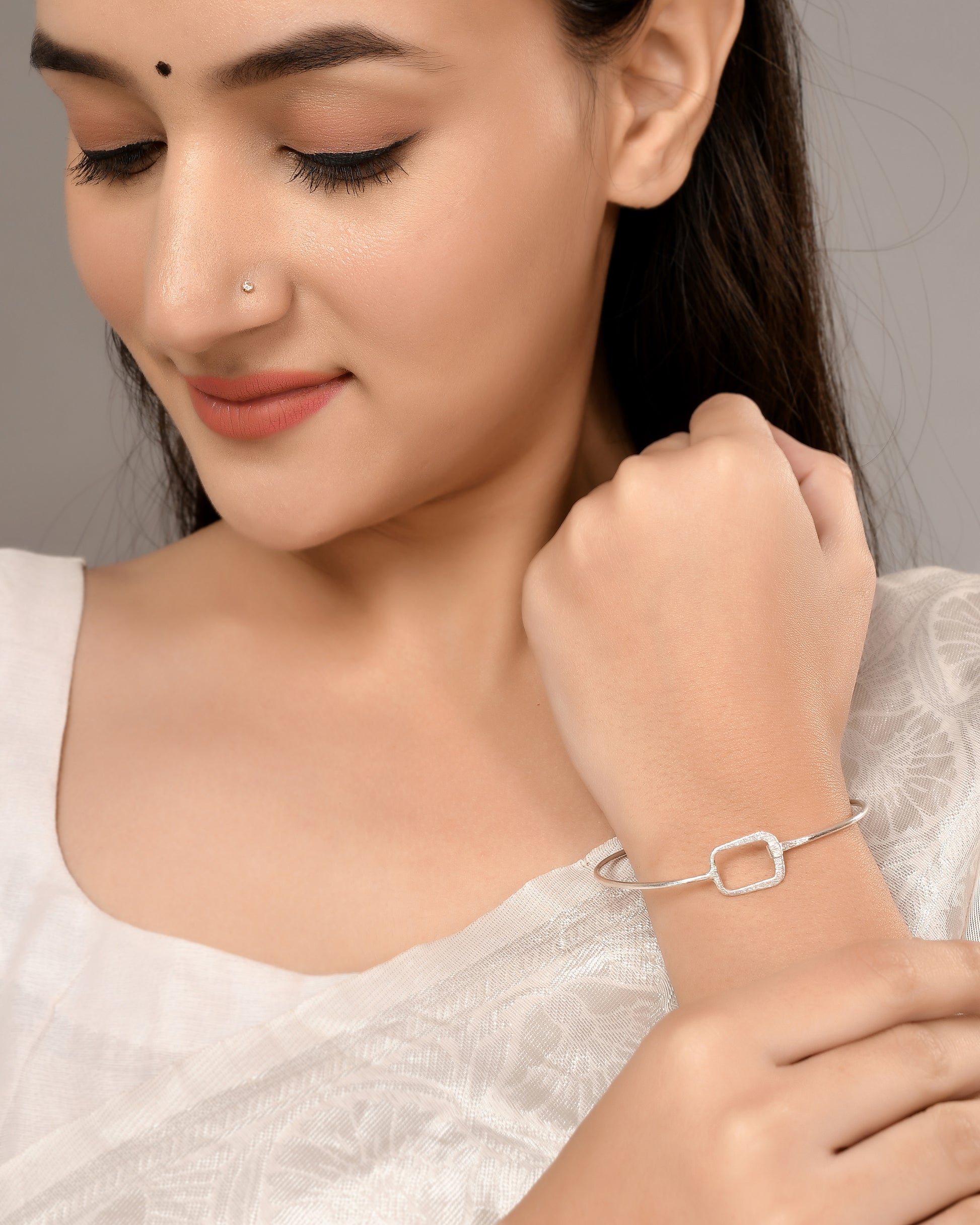 The Square Knot Silver Cuff Bangle from Antique Silver Strike is a refined expression of minimalism. Made from pure 925 sterling silver, this slender handcrafted cuff wraps gracefully around the wrist, highlighted by a unique square knot accent. The clean, open-ended design offers an easy fit and a timeless silhouette — ideal for stacking or wearing solo.