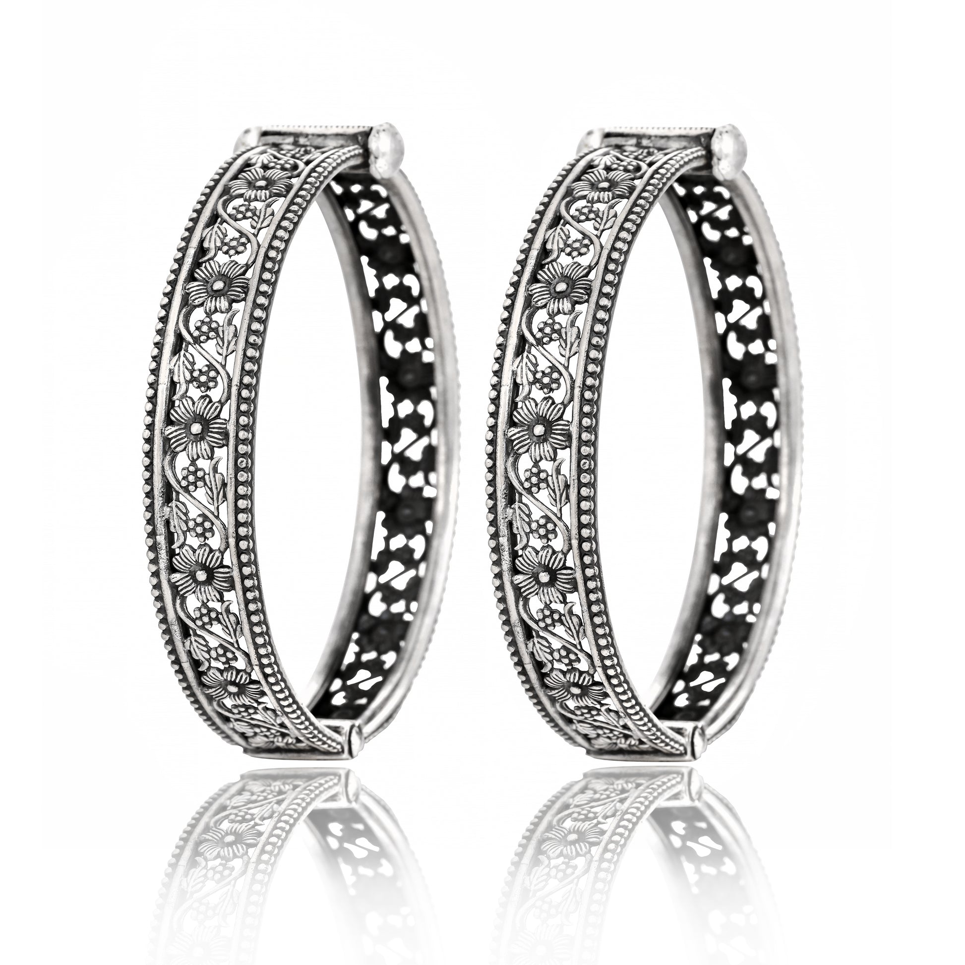 Crafted with intricate detailing, the Vintage Floral Linework Silver Kada Bangles from Antique Silver Strike reflect traditional craftsmanship at its finest. Each bangle features finely carved floral patterns that exude a vintage charm, enhanced by an oxidized silver finish. These kada-style bangles are not just accessories but a tribute to age-old design sensibilities. Ideal for ethnic outfits, festive occasions, or daily elegance, they offer a timeless touch that speaks volumes of heritage and understated beauty.